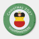 Round magnet for Christmas decor featuring an angel dressed in the flag of Germany. The German Christmas angel is found inside a white circle of squiggly squares with a background of green squiggly squares. Add your own text, if you wish. Personalize with a name and customize with the year. Fun stocking stuffer. Honour your German heritage during the holiday season.