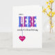 This is a pretty birthday card for a german friend or relative. The word LIEBE on the front is in blue-pink colored capital letters overlaid with a pattern of white flowers. The greeting is "Alles Liebe zum Geburtstag" (= "With love on your birthday"). A deep pink heart hangs from the letter L, and this can be personalized with your preferred name or text.