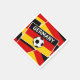 The flag of Germany, tricolour, displaying the national colours of Germany: black, red, and gold. In the middle there picture of a black and white, soccer ball / football. The text, in white reads Germany.