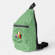 Personalized sling bag shows the German, Ireland, and United States of America shamrock featuring a different flag in each leaf. On top, in circular, dark green, Celtic style letters are the words THREE CULTURES. On the bottom, in similar lettering, are the words ONE YOURNAME. Place your name on the appropriate place for a look. Need a personalized gift? Just add someone else's name. All of this design has a background fractal of light green squiggly squares. Designed to celebrate St. Patrick's Day, 4th of July and Octoberfest. Perfect for travel needs or back to school gift.