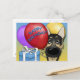 Adorable Big Nose German Shepherd with a birthday present and holding balloons in his mouth. Balloon reads Rappy Rirthday!