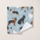 Cute German Shepherds in black and tan, black and red, black and silver, white and back colour coats sit and stand with scattered dog bones and paw prints on a light blue background.