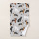 Cute German Shepherds in black and tan, black and red, black and silver, white and back colour coats sit and stand with scattered dog bones and paw prints on a light grey background.
