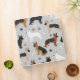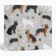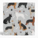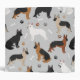 Cute German Shepherds in black and tan, black and red, black and silver, white and back colour coats sit and stand with scattered dog bones and paw prints on a light grey background.