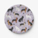 Cute German Shepherds in black and tan, black and red, black and silver, white and back colour coats sit and stand with scattered dog bones and paw prints on a light purple background.