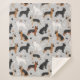 Cute German Shepherds in black and tan, black and red, black and silver, white and back colour coats sit and stand with scattered dog bones and paw prints on a light grey background.