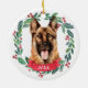 Decorate your tree or give a special gift this holiday season with this elegant Merry Christmas German Shepherd in a wreath design christmas ornament, and matching decor. This german shepherd christmas ornament features a watercolor dog in a green and red wreath with holly and berries. Personalize with name front and year back. This german shepherd christmas ornament will be a favorite among german shepherd lovers, dog lovers, and animal lovers. Visit our collection for matching german shepherd christmas cards, home decor, and gifts. COPYRIGHT © 2020 Judy Burrows, Black Dog Art - All Rights Reserved. German Shepherd Christmas Elegant Watercolor Dog Ceramic Ornament