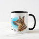 A watercolor portrait of a gorgeous German Shepherd Dog is the feature on two sides of this mug. Each image is placed on a bright blue spatter background. Between the two images is the text that describes this loyal and courageous companion, with "the GERMAN SHEPHERD dog" in black at the bottom. All the text is easily customized to anything you'd prefer; describe your own loyal friend! This mug describes mine.