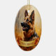 A German Shepherd dog, with a black leather collar, sits amidst a bed of fallen autumn leaves. The dog's fur is a mix of brown and black, and its eyes are alert and focused. The background is a soft blur of golden and brown tones, suggesting a forest setting. The overall mood of the image is one of tranquillity and warmth, with the dog appearing relaxed and content in its surroundings. Perfect gift for German shepherd lovers.