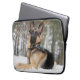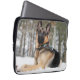 German Shepherd dog posing in the snow wearing a camoflaug coloured bandana.