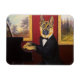 This design features German Shepherd elegantly dressed in a black frock coat, white shirt, near the piano, against a red wall with paintings in gold frames.