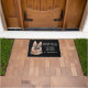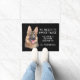 "No need to knock twice, We have a German Shepherd" declares this funny door mat. The text is in white at the right side, while a portrait of a beautiful black and tan GSD is at the left. Everything is placed on a black background.