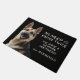 "No need to knock twice, We have a German Shepherd" declares this funny door mat. The text is in pale tan at the right side, while a portrait of a beautiful GSD is at the left. Everything is placed on a black background.