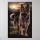 A German Shepherd dog stands proudly against a backdrop of mountains at sunrise. The sun is rising behind the dog, casting a warm glow on its fur. The dog is looking directly at the viewer, with a determined expression on its face. Below the dog is a quote about courage.