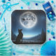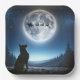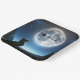 A German Shepherd dog looks up at a full moon where Santa's sleigh and reindeer are silhouetted against a bright full moon