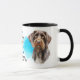 A watercolor portrait of a beautiful German Wirehaired Pointer Dog is the feature on two sides of this mug. Each image is placed on a bright blue splatter background. Between the two images is the text that describes this loyal and playful companion, with "the WIREHAIRED POINTER dog" in black at the bottom. All the text is easily customized to anything you'd prefer so that you may personalize it or describe your own loyal friend!