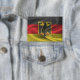 Button with the flag of Germany in wavy fabric style design. This design features the German flag horizontally striped flag of black, red, and gold colours with a beautiful waving material textured effect. This flag design is a great way to show you are proud to be from Germany.