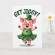 This card shows an upbeat, human-like pig dancing on a bright white background, with arms stretched wide and one leg lifted as if inviting a friend to join in 💚. Its soft pink skin, rosy cheeks, and sparkling green eyes pair with a wide open smile that feels like it’s aimed at someone just off to the side. The pig wears an emerald green top hat with a shiny gold buckle, adding a dressed-up touch that reads sweet and flirty rather than formal. A matching green sleeveless tunic features a large three-leaf shamrock on the chest, keeping the St. Patrick’s Day theme front and center ☘️. A fuller, pleated skirt in a deeper green swings outward, suggesting motion and a little twirl meant for company. Above the character, the words “GET JIGGY!” curve in dark green, arcing over the pig like a cheerful banner. Thin golden bands trace the skirt’s hem as it flares, and the hat’s buckle catches the light against the plain white space.