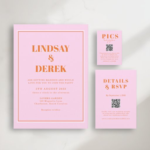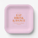 GET READY TO EAT DRINK AND DANCE! Modern pink, orange, bold font, wedding custom paper plates with your names and date.