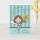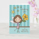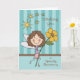 A cute card for a hospital fairy to give to patients who are recovering from anything which features an adorable brown haired fairy holding a large sunflower with stars over her head against a pretty light and dark blue striped background with brown text to match her hair. Design by Laurie Schneider/Elements by Scrappin Doodles