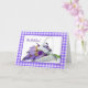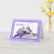 Iris bouquet in a white wicker basket with purple gingham background for getting well soon.