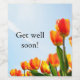 Wine bottle label with the customizable text 'Get well soon!' on a background with flowers consisting of orange and red tulips seen from a low point of view against a blue sky.