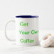 custom-made coffee mug with blue trim. Words say "Get your own coffee" on 1 side of mug.