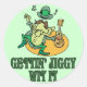 An Irishman dressed in a green suit and carrying a fiddle and dancing a jig with caption Gettin' Jiggy Wit It.