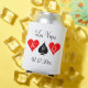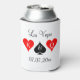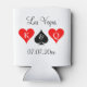 Getting married Las Vegas custom wedding party Can Cooler. Classy white beverage holder with couple's logo. Hearts and spade design with initials of bride and groom plus date of marriage. Personalize with destination name. Best for gambling / casino theme parties. Fun party favour for guests. Lucky in love in the marriage capital of the world.