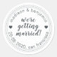 Chic and simple save the date label, with your names and wedding date in off-black modern typography on a white background, and the text 'we're getting married' in stylish script calligraphy font. Use these wedding stickers for your wedding gifts, gift bags or as a save the date envelope seal. Exclusively designed for you by Happy Dolphin Studio. If you need any help or matching products, please contact us at happydolphinstudio@outlook.com.