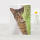 Tabby cat peeking around shredded green scratching post for getting old birthday humour.