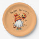 Conjure a delightfully eerie Halloween with this Classic Ghost Halloween Party Plate! Ghostly Tableware for your Halloween Celebrations that will keep your Goodies Spooky and allow you to Eat, Drink, and be Scary! This Cute Ghost is wearing an Orange Knit Hat and Orange Sneakers, holding a Pumpkin Balloon, and holding a Jack-O-Lantern bucket for his Halloween Candy. He is surrounded by Bats in flight. The Verse says, "Happy Halloween." Personalize this Spellbinding Halloween Party Tableware to your Hearts content, and elevate your Halloween Bash!