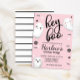 A not so spooky halloween party! Pastel pink Hey Boo Ghost Halloween Birthday invitation with black and white stripe background.