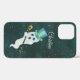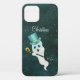 This iPhone case has a white ghost in a dark night sky with stars with big blue eyes wearing a blue top hat and holding a fancy black cane with a gold skull and trim. Customize your name or text with the template.