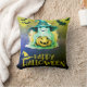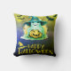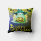 The colour palette of the pillow exudes the vibrant spirit of Halloween, with lively greens and blues coming together to create a sense of excitement and delight. This design captures the perfect balance between cuteness and festivity, celebrating Halloween as a time for spirited celebration.