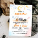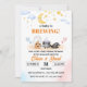 This baby shower invitation features a whimsical Halloween theme with a cute ghost holding a pumpkin, a cauldron, a witch hat, and a small skull. Above, a dreamy night sky with clouds, a crescent moon, stars, and pastel hearts adds a soft, magical touch, blending spooky and sweet elements.