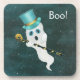 This set of hard plastic coasters with cork backing have a white ghost with bright blue eyes wearing a fancy blue top hat and holding a gold trimmed black cane with a gold skull on a star dotted night sky background. customize the Boo text with the template.