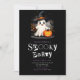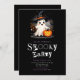 At the top of the invitation, a super cute ghost takes centre stage, dressed in a black witch's hat adorned with gold stars. Holding a magical book, this charming ghost stands confidently behind a glowing jack-o'-lantern, adding both a touch of whimsy and mystery to the design. Surrounding the ghost are twinkling stars and fluttering bats, completing the enchanting scene with a mix of playful and spooky elements.
