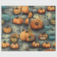 This design features a captivating blend of pumpkins in a variety of warm orange and cool teal hues, set against a cracked, moonlit background. The pumpkins are arranged in a layered pattern, intertwined with dark, twisted vines that create a sense of depth and texture. Some of the pumpkins are carved into jack-o'-lanterns with glowing, mischievous grins, while others remain uncarved, adding contrast and variety to the composition. The muted tones of the background enhance the vibrant colours of the pumpkins, giving the overall design a slightly eerie yet whimsical feel.