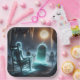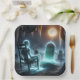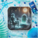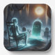 A ghostly male figure sits in a rocking chair, facing a gravestone marked "R.I.P." under a full moon