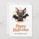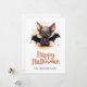 Happy Halloween card featuring a cute watercolor illustration of a bat, pumpkins and ghosts. Easily personalize this Halloween card for kids with your family name and text.