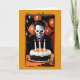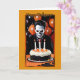 This Halloween card features a unique and spooky twist on a traditional celebration. The central image shows a menacing figure with a skeletal face, dark sunken eyes, and slicked-back black hair, dressed in black, standing behind a Halloween-themed cake. The cake, decorated in orange and white icing, is topped with three lit candles, casting an eerie glow on the figure's face. The background is filled with orange and black balloons, adding a festive yet creepy atmosphere to the scene.