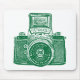 A Mouse pad with a high contrast, high passed filtered and vectorized image of a vintage East German camera from the 1950s. Creating a strong bold toothy retro screen print. or medieval Gothic brass rubbing like effect.