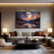 A giant moon dominates the night sky, illuminating snow-capped mountains and reflecting on a calm lake. Tall trees frame the shores, while orange and blue clouds paint the horizon. Stars twinkle around, creating a magical scene that conveys peace and wonder. Perfect for evoking dreams and connections with wild nature, this artwork blends celestial beauty and earthly tranquillity in a single moment.