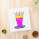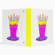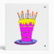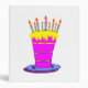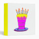A giant birthday cake with pink and yellow frosting dripping icing and blue glowing candles.