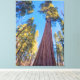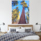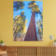 A towering sequoia tree dominates the frame, its massive trunk reaching towards a clear blue sky. The tree's bark is a rich reddish-brown, with deep furrows and textures. The viewer's perspective is from below, looking up at the tree, emphasizing its immense size. Other redwood trees surround the central tree, their green foliage creating a dense canopy overhead.