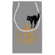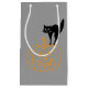 Orange pumpkin jack-o-lantern and a startled black cat standing on top. Grey background.