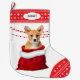 The front of this Holiday stocking shows an image of an adorable Corgi puppy peeking out of a red and white Santa style gift bag. Behind the dog is a red beaded garland. The toe and top border are a red and white snowflake pattern. On the top border is a white label with your custom text in dark grey. The back of the stocking is the same red and white snowflake pattern.