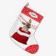 The front of this Holiday stocking shows an image of an adorable brown Chihuahua puppy peeking out of a red and white Santa style gift bag. Behind the dog is a red beaded garland. The toe and top border are a red and white snowflake pattern. On the top border is a white label with your custom text in dark grey. The back of the stocking is the same red and white snowflake pattern.
