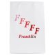 Red name and initials. Personalize by entering your Initial (replicates 5 times), and your name. Initial will show in five increasingly darker shades of pink and red from upper left to lower right. Name will be in darkest red. Same on both sides.